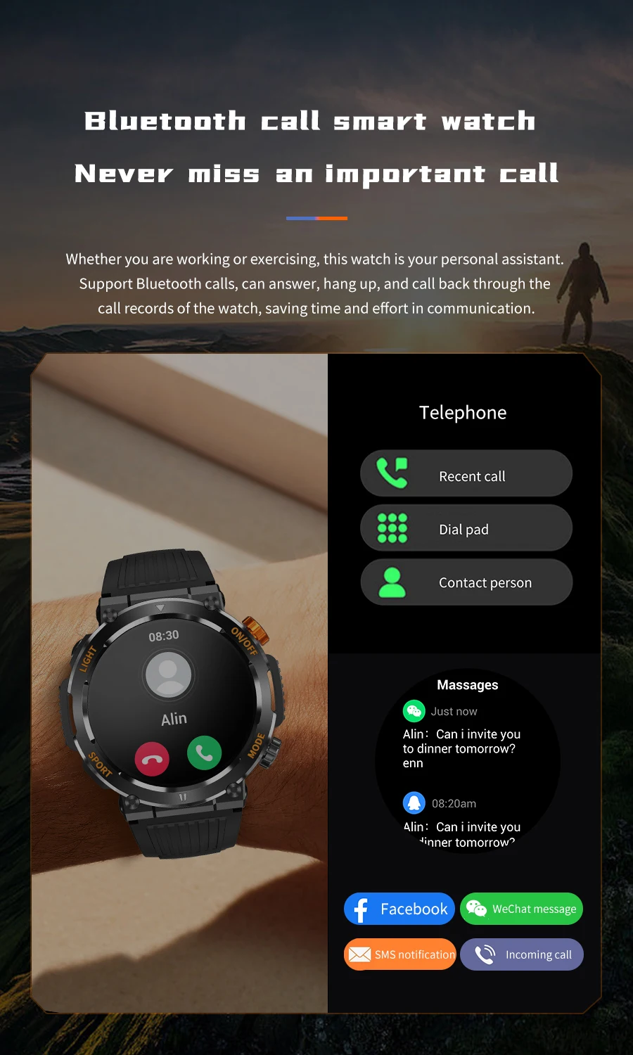 Function: Passometer,fitness tracker,sleep tracker,Message Reminder,Call Reminder,Answer Call,24 hour instruction,Chronograph,World Time,Calorie Counter,week,Phase of the Moon,Heart Rate Tracker,Interactive Music,Noctilucent,Calendar,Compass