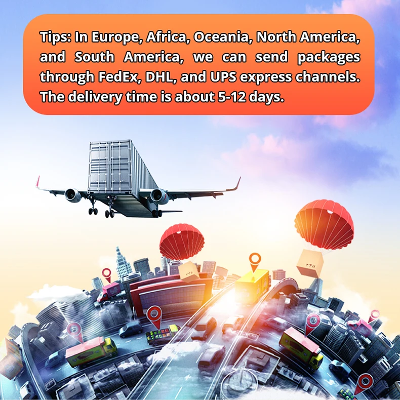 In Europe, Africa, Oceania, North America, and South America, we can send packages through FedEx, DHL, and UPS express channels. The delivery time is about 5-12 days