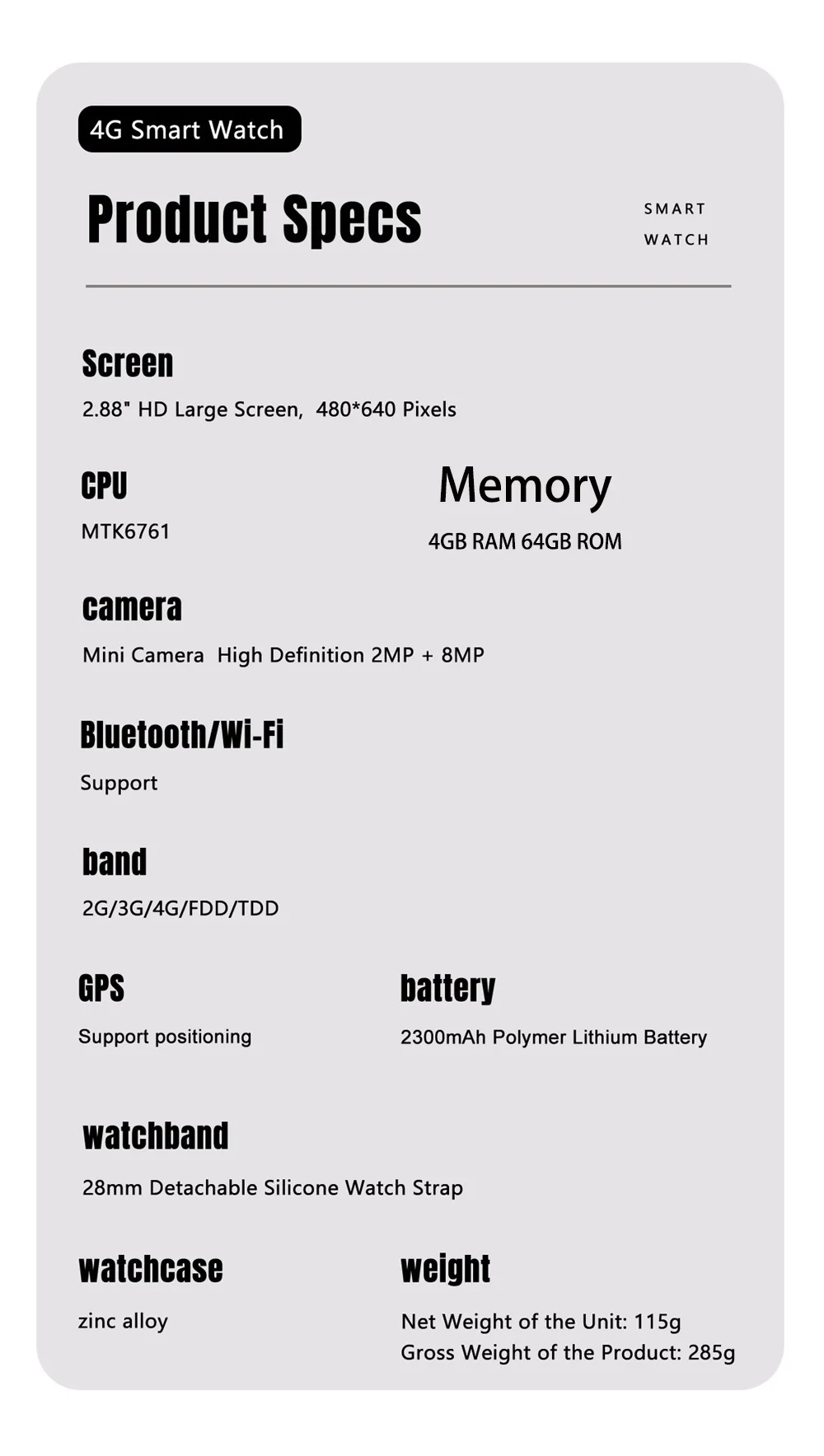 It supports the manual selection of language on the watch, answering and making calls, WIFI, GPS, phonebook, sending SMS, downloading app, video call, photo taking, alarm clock, calendar, calculator, recording, local music playing, weather, voice search, step counting, heart rate, multi exercise mode, stopwatch, holding up the hand to light the screen, changing the dial, etc.