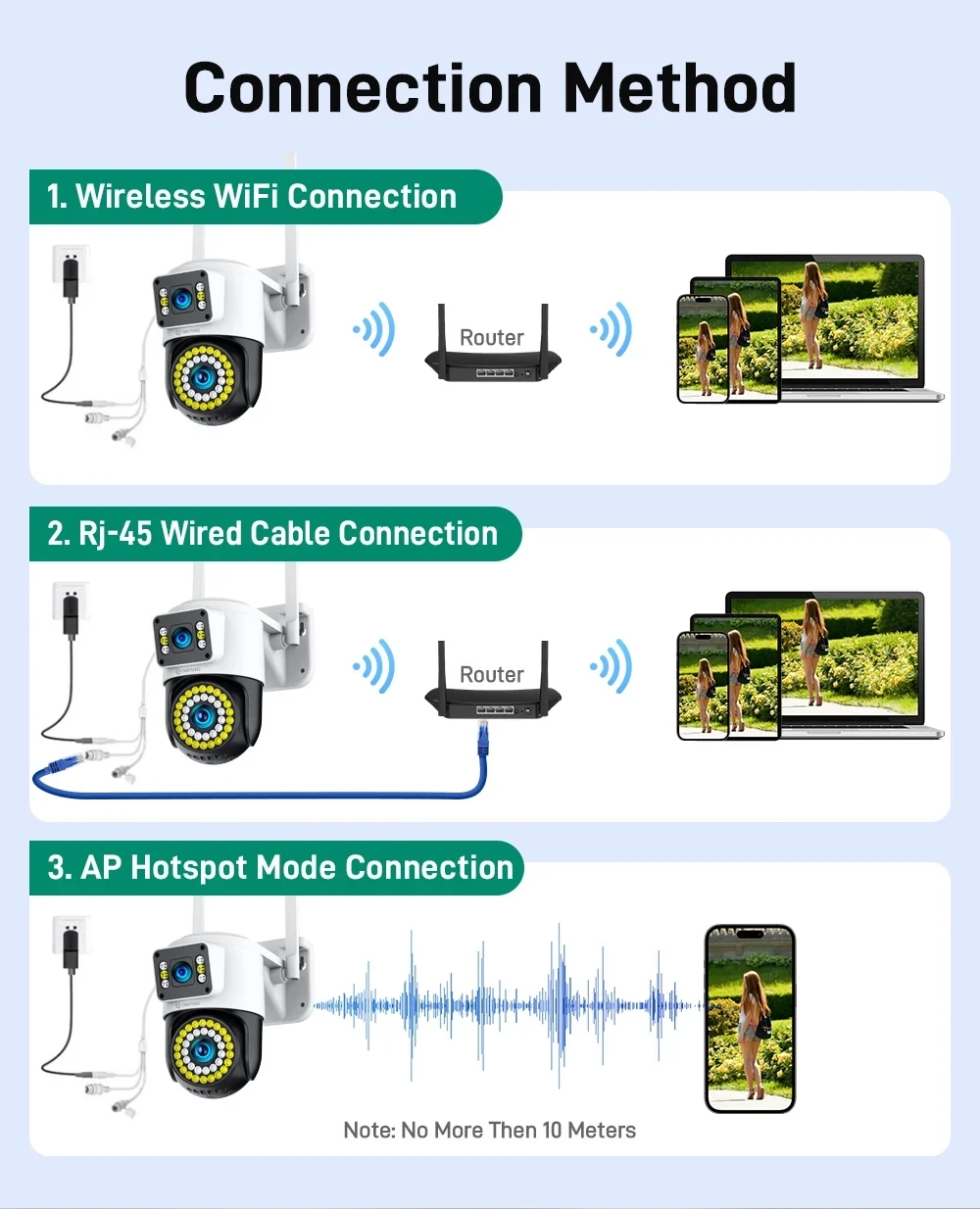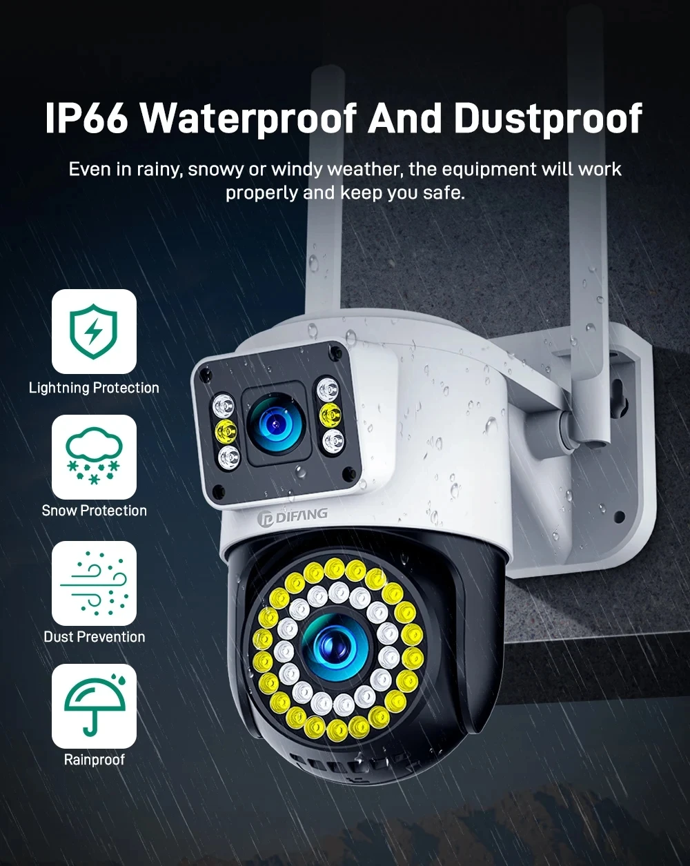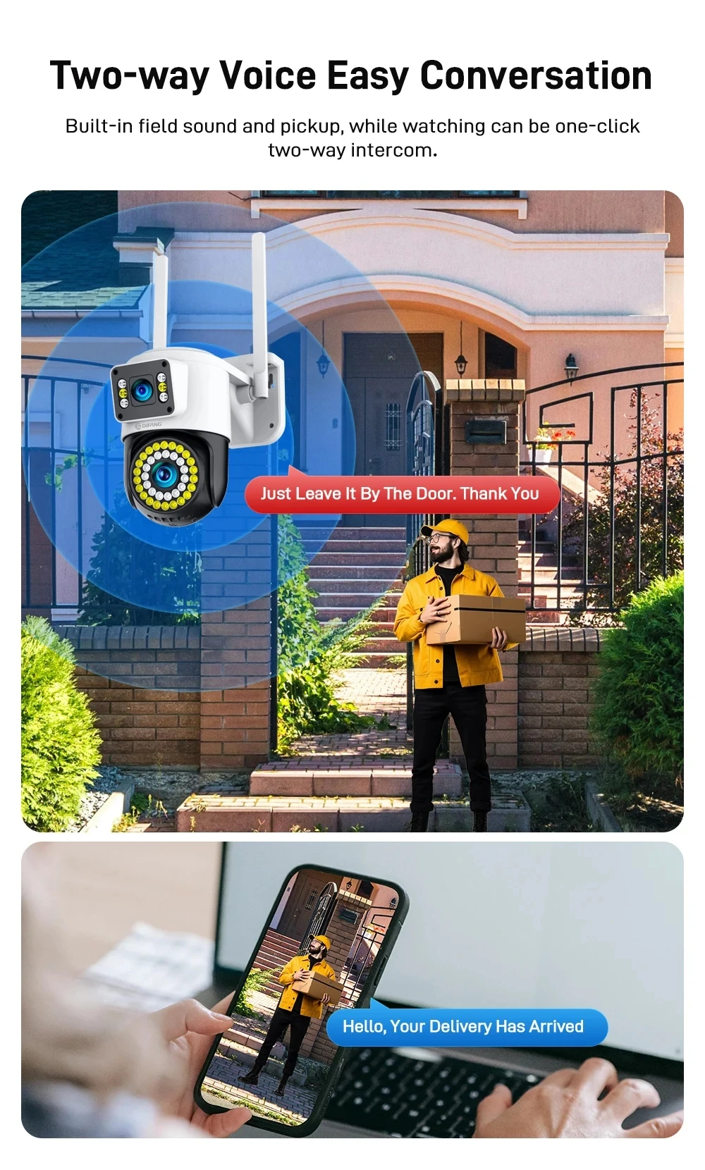 *Intelligent infrared human body induction alarm; the main camera is the PTZ camera, which can be controlled by APP from left to right, and the auxiliary camera is the bullet camera, which can be manually rotated 180 degrees left and right. Dual screens and double light board images are clearer and more delicate.