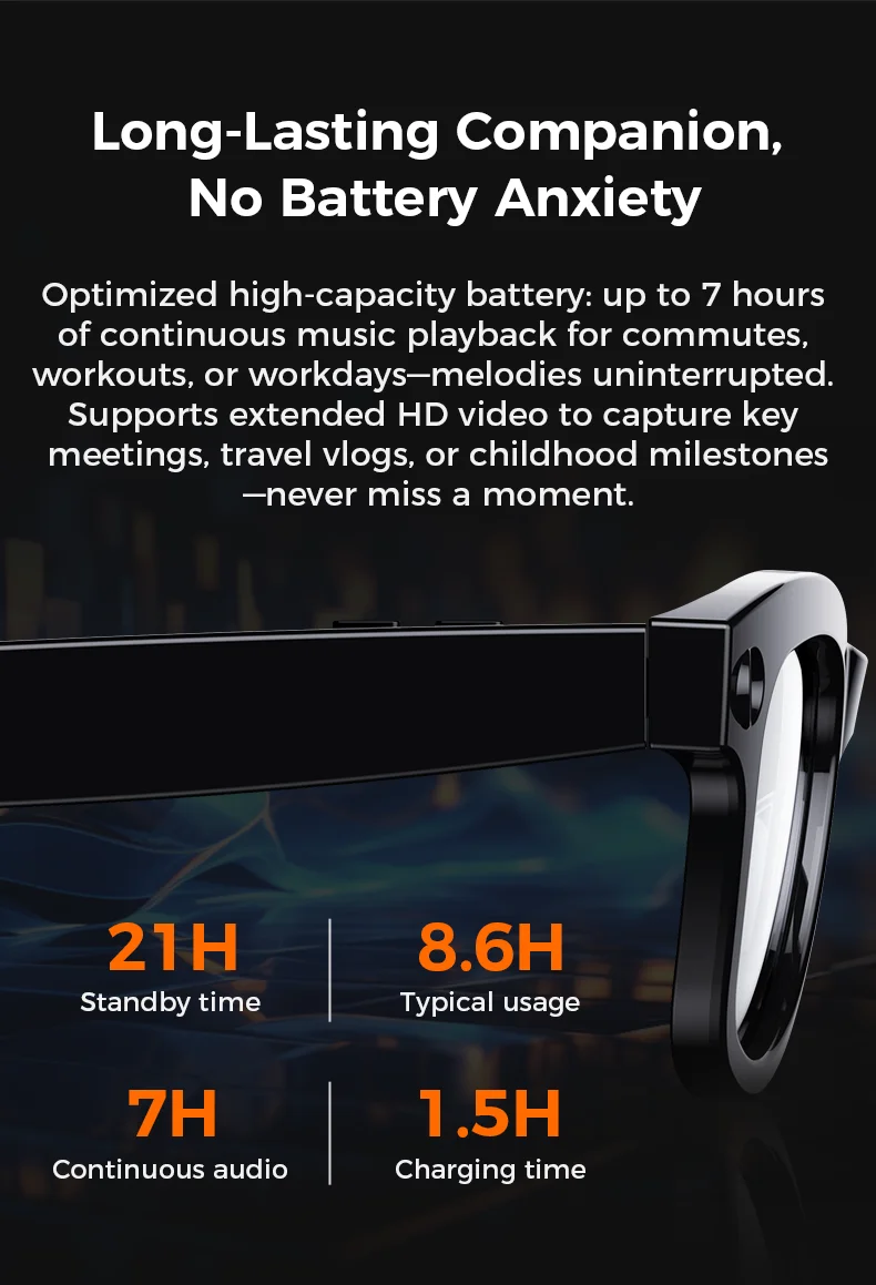 Support functions: voice wake-up, music playback, music control, making and receiving calls, shooting, access to Chat GPT large model, picture viewing, real-time translation, etc., shooting anti-shake, wifi transmission, dual-microphone noise reduction, single touch, wear detection, etc.