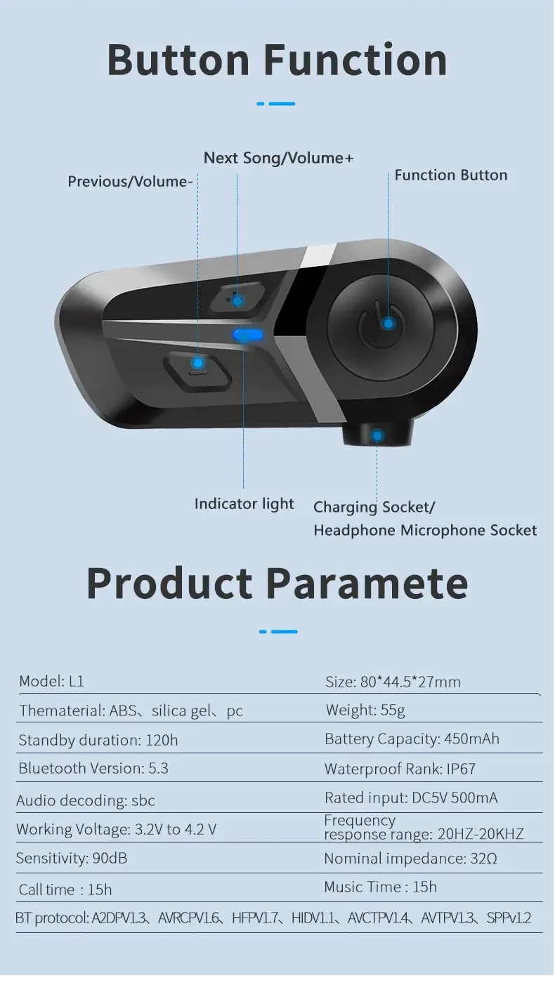 Bluetooth 5.3 wireless hands-free calling headset, motorcycle helmet music player, waterproof motorcycle helmet headset