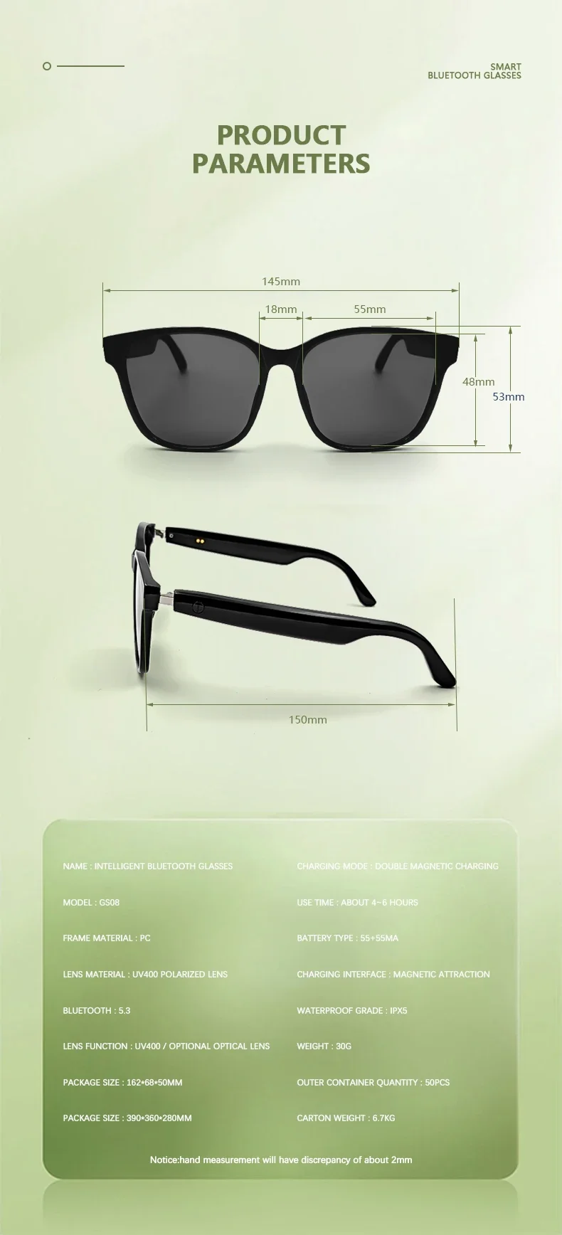 AI voice wake-up, AI photo recognition, AI intelligent question-and-answer interaction, AI smart translation, high-definition photography and video recording (with anti-shake function), recording, Wi-Fi transfer of photos, videos, and recordings to phone, slide to adjust volume, wear detection, dual microphone noise reduction, call noise reduction, intelligent voice assistant, Bluetooth calls, music playback (switch, pause music), low power consumption Jerry + Allwinner main control chip, long-lasting battery life, dual physical buttons plus slide touch for convenient operation, 30 grams lightweight overall weight for comfortable wearing, customizable sunglasses, blue light protection, color-changing, myopia, and other lenses, {need to be customized}