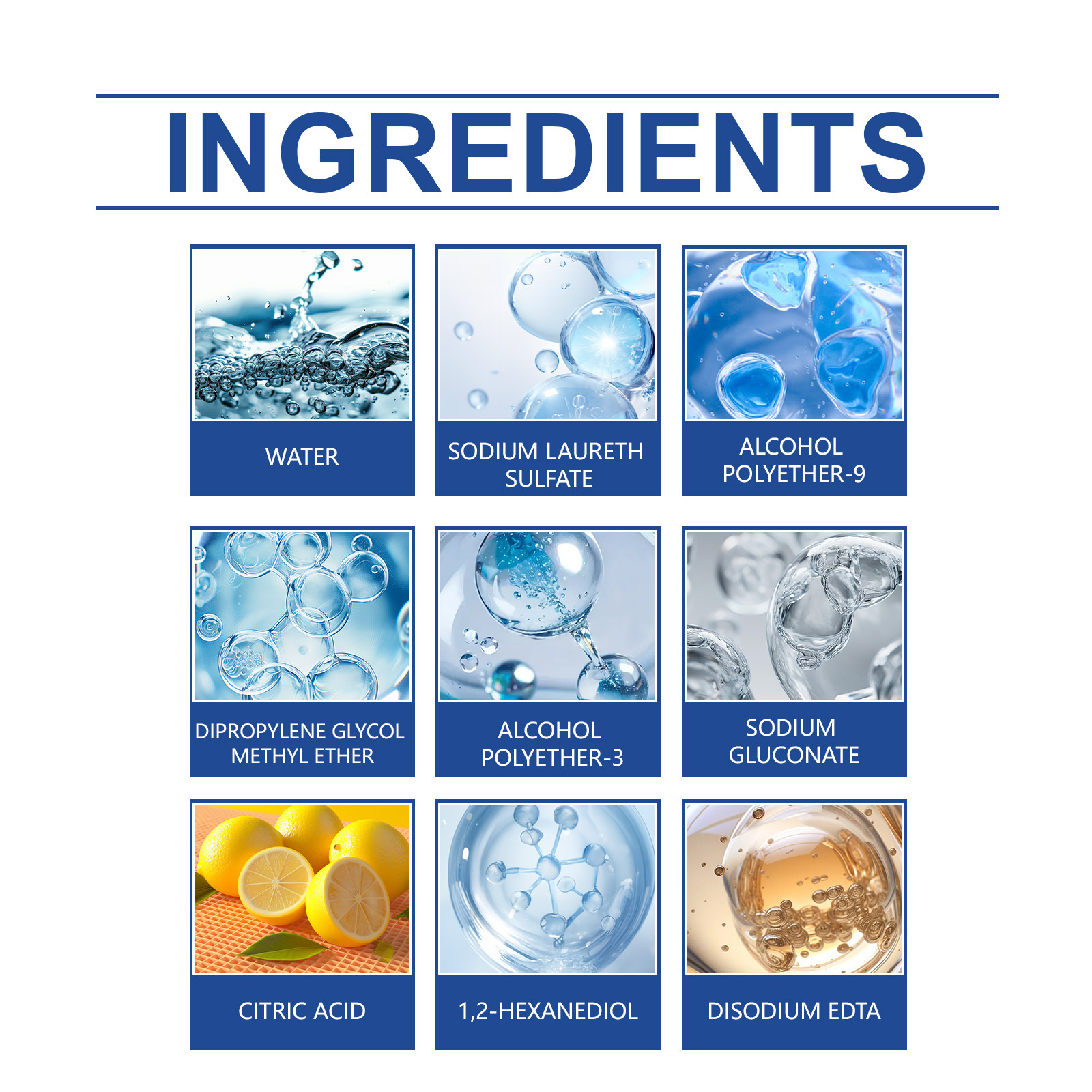 Product Ingredients: Water, Sodium Laureth Sulfate, Polyether 3/Polyether 9 of Fatty Alcohols, Dimethyl Dipropylene Glycol, Sodium Citrate/Gluconate, 1,2-Hexanediol, Disodium EDTA