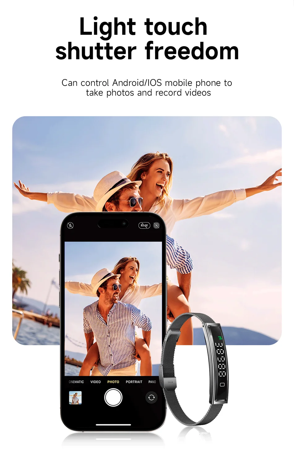 24H real-time monitoring, heart rate, blood oxygen, stress test, sleep monitoring(sleep time, sleep quality), multiple sports modes, step, step counting, camera control, multi-language (APP), access WeChat Sports & iOS Health.