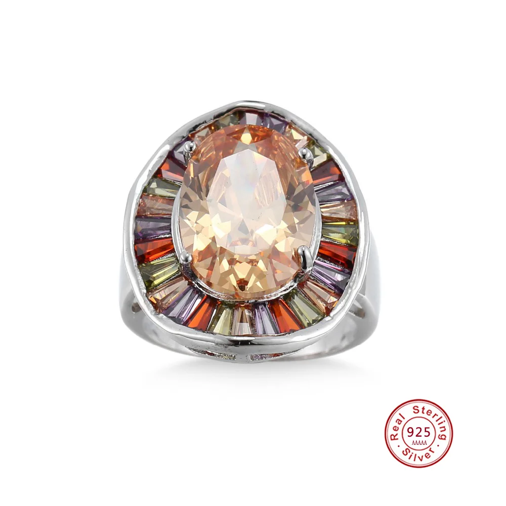 New Statement Bridal Big Round Colorful CZ Finger 925 Sterling Silver Rings Champagne Cubic Zircon Jewelry for Women Party Gift