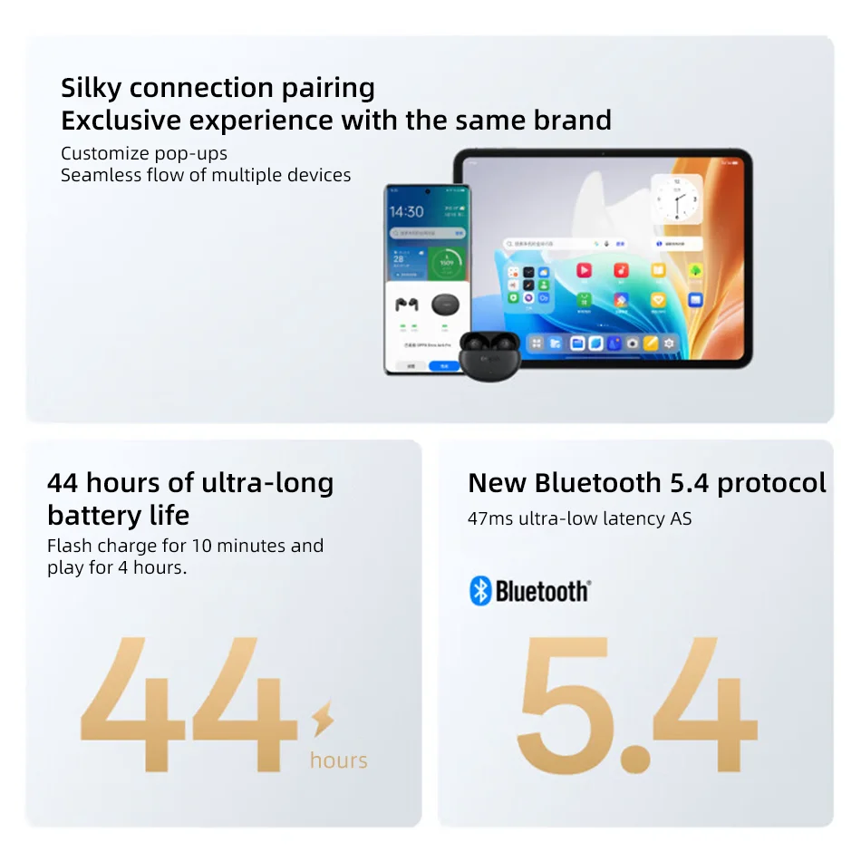 BT 5.4/AAC/SBC/IP55/LHDC5.0(Notice:LHDC 5.0 ultra-clear transmission protocol (1Mbps) compared with the traditional AAC transmission protocol (256kbps), the highest bit rate is increased by about 4 times.The LHDC transmission function requires two devices connected by Bluetooth to support the LHDC transmission protocol at the same time.OPPO and Oneplus mobile phone OS systems supported by LHDC 5.0 need to support ColorOS 13.1 and above, and are Find series, Reno series, Oneplus Digital series, and Oneplus Ace series mobile phones released by Find X6 and later. For specific support, please consult customer service for confirmation.)