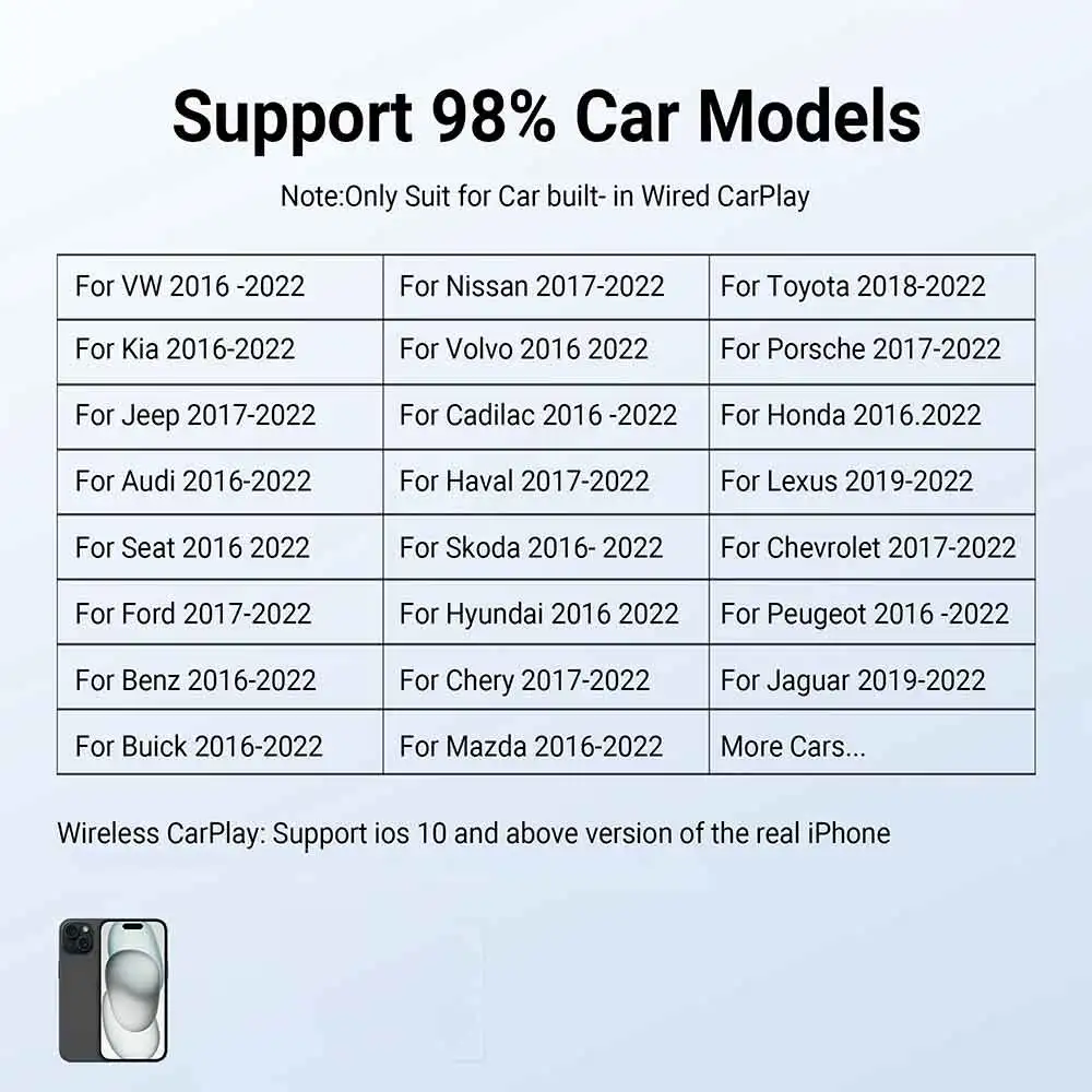 ① Support 500+ Vehicle Models. Work for original car screen equiped with Wired CarPlay , such as: for Audi, for Mercedes-Benz,for Chevrolet, for Ford, for Porsche, for Volvo, for Volkswagen,for Kia,for Lexus, for Hyundai , for Honda,for Toyota, for Mazda, for Land Rover, for Jeep, for Subaru etc.