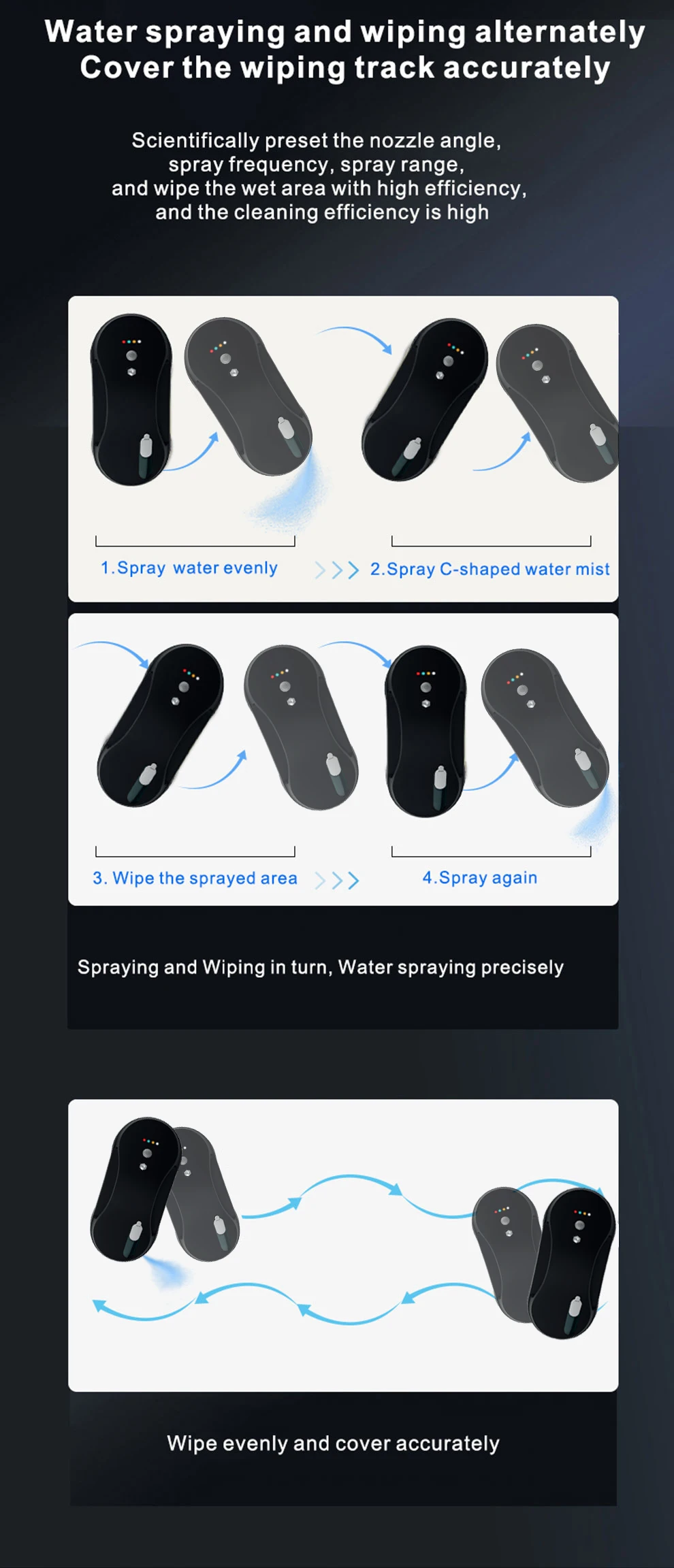 1. Spray water evenly , 2. Spray C-shaped water mist , 3. Wipe the sprayed area , 4. Spray again.