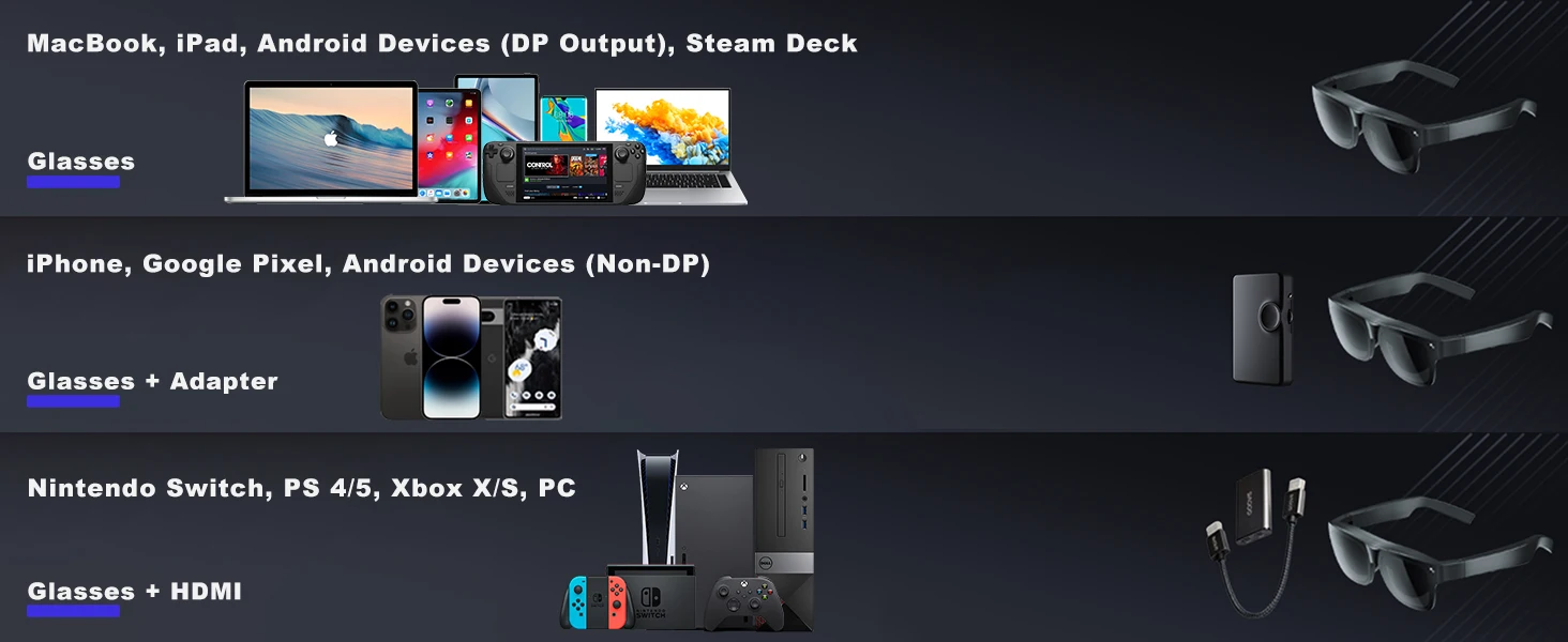 𝐌𝐮𝐥𝐭𝐢-𝐃𝐞𝐯𝐢𝐜𝐞 𝐂𝐨𝐦𝐩𝐚𝐭𝐢𝐛𝐢𝐥𝐢𝐭𝐲: RayNeo Air Plus is compatible with smartphones, tablets, PCs, and gaming consoles. Connect via Magnetic USB Type-C DisplayPort, (See compatibility list below for details, additional portable adapter required for 𝗶𝗢𝗦 𝗱𝗲𝘃𝗶𝗰𝗲𝘀, sold separately).