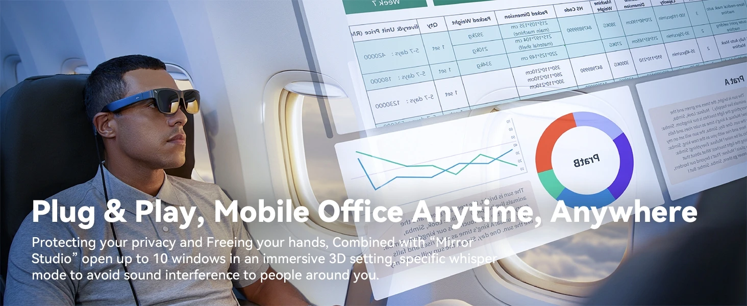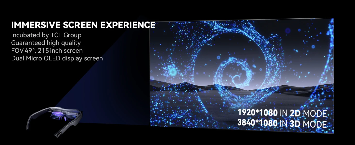 𝐈𝐦𝐦𝐞𝐫𝐬𝐢𝐯𝐞 𝐒𝐜𝐫𝐞𝐞𝐧 𝐄𝐱𝐩𝐞𝐫𝐢𝐞𝐧𝐜𝐞: Enjoy 𝟮𝟬𝟭-𝙞𝙣𝙘𝙝 dual Micro OLED displays at 6 meters distance, With up to 400 nits of brightness, you can see clearly even outdoors. Switch between 2D/3D mode with just one click: 1920 x 1080 in 2D mode and 3840 x 1080 in 3D mode.