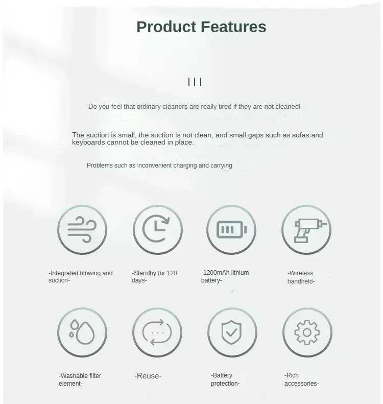 4. Small and Portable :The vacuum cleaner is small and lightweight, making it easy to carry around and store in small spaces.