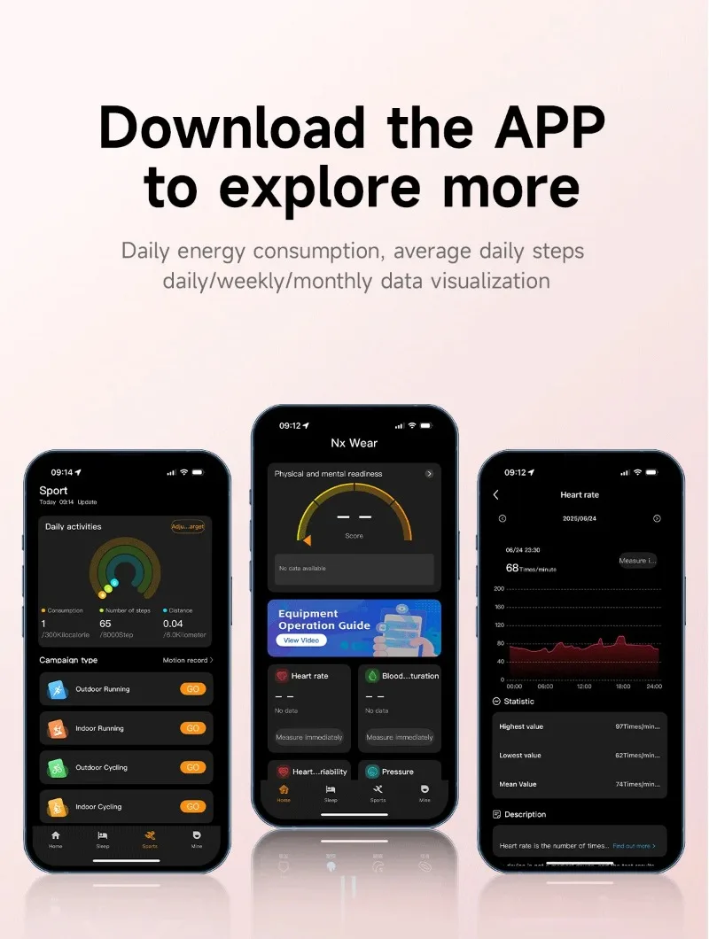 * Real-time data monitoring via mobile app: Connect the wristband to your phone via Bluetooth. Keep Bluetooth enabled; it will automatically connect when you launch the app. Even when your phone is disconnected, the wristband can independently monitor your body, recording blood oxygen and heart rate, and updating the data in the app once connected.